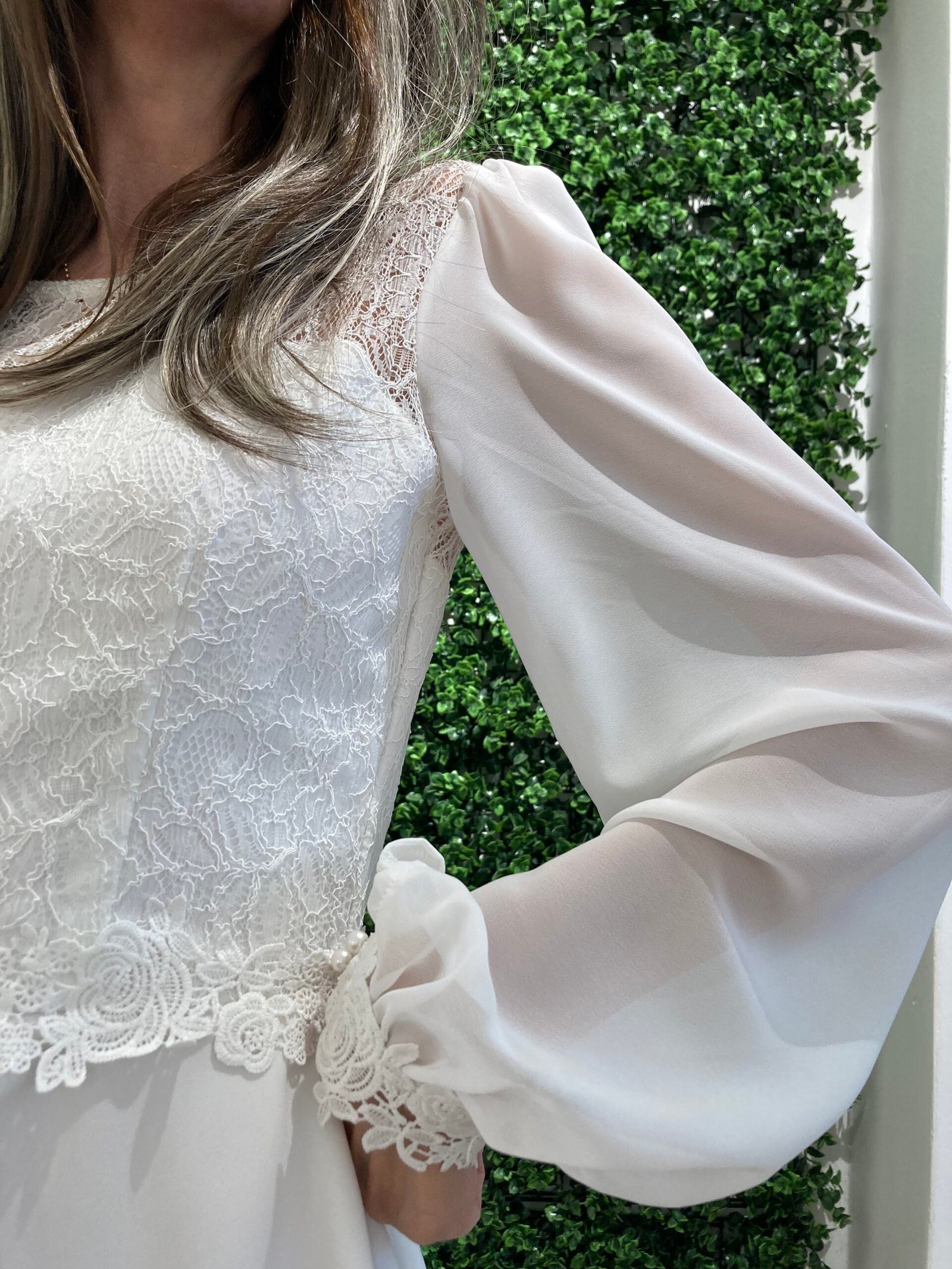 Konfirmationskjole KARINA 2026 er en elegant og detaljeret kjole, der forener romantisk blonde med moderne design. Denne kjole er skabt til pigen, der ønsker et feminint og luksuriøst udtryk på sin konfirmationsdag. Den smukke blondeoverdel giver et eksklusivt look, mens de lange chiffonærmer tilføjer lethed og bevægelse. Ærmerne afsluttes med fine blonde manchetter, prydet med små perleknapper, som giver et strejf af klassisk håndværk og elegance.