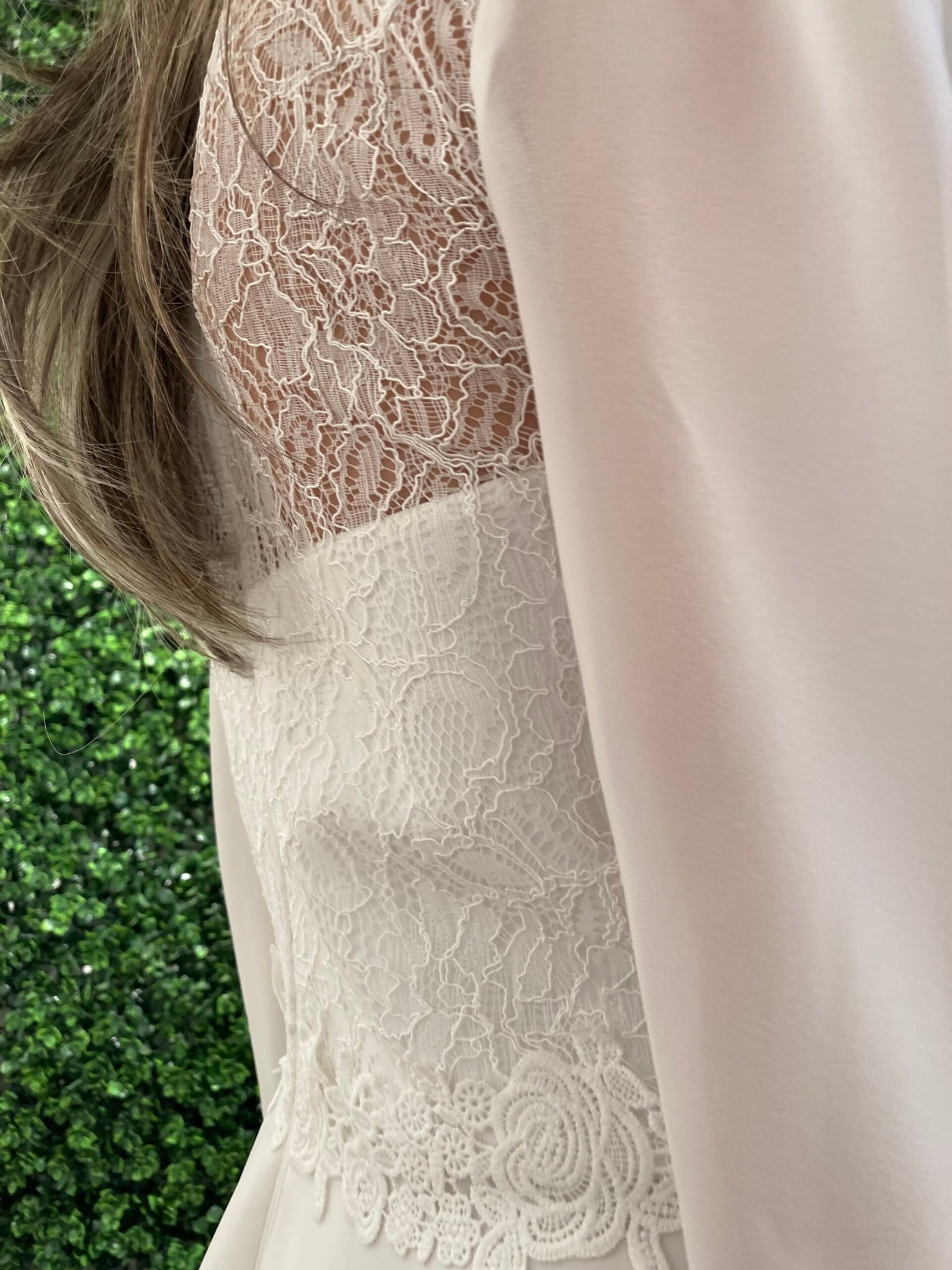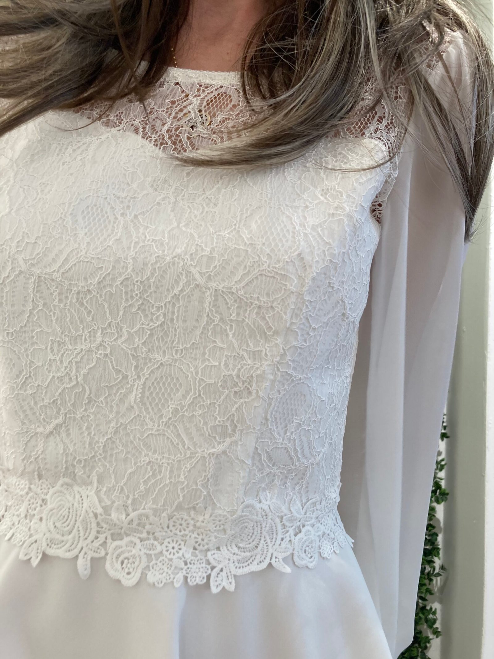 Konfirmationskjole KARINA 2026 er et oplagt valg for den modebevidste konfirmand, der sætter pris på håndværk og skønhed. Med sine fine blondedetaljer, perleknapper og lette chiffonærmer repræsenterer kjolen både tradition og nutidig elegance. Den passer perfekt til både stilfulde billeder og en uforglemmelig festdag, hvor du kan føle dig selvsikker, smuk og helt unik.
