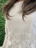Konfirmationskjole LINDA 2026 er en unik og elegant konfirmationskjole, designet til piger, der ønsker et stilfuldt og romantisk look. Kjolen har lange chiffonærmer med puf-effekt og elastik i bunden, som skaber et feminint og behageligt snit. Ærmerne er smukt broderet med store blomster motiver, hvilket giver kjolen et eksklusivt og dekorativt udtryk.