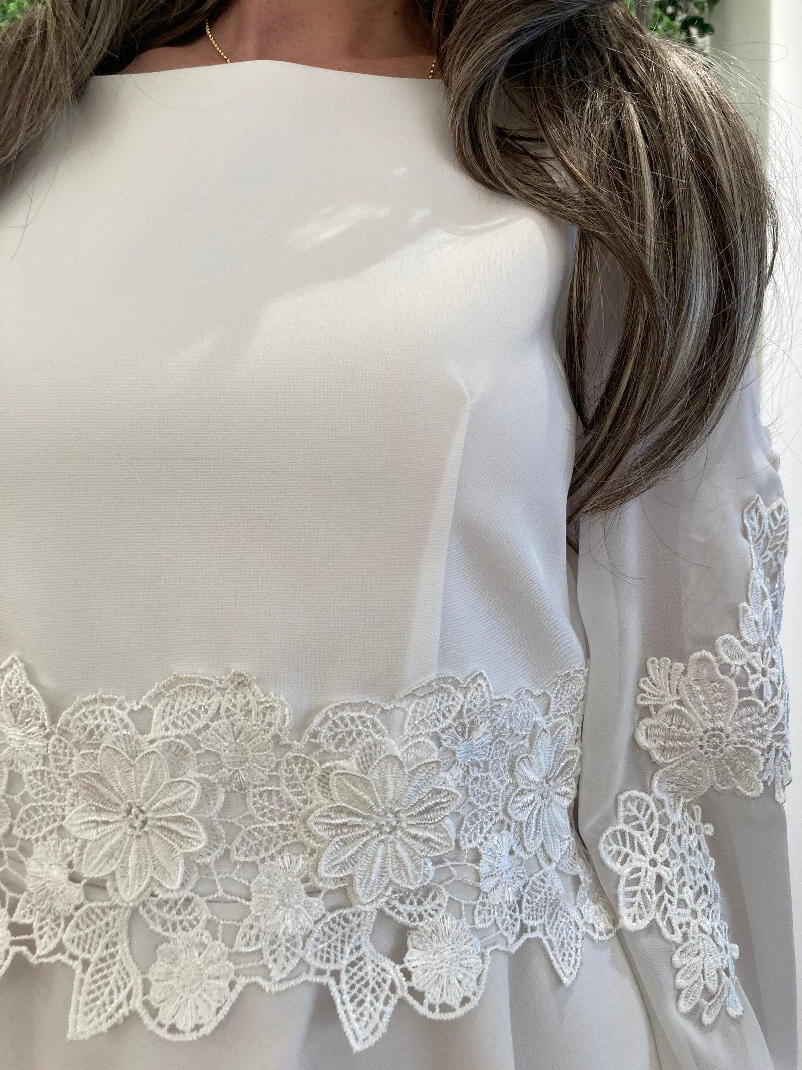 Kjolen er knælang og giver et ungdommeligt, elegant og klassisk udtryk. Kombinationen af chiffon, broderede blomster og 3D-blonde gør LINDA 2026 til en populær konfirmationskjole blandt moderne konfirmander.